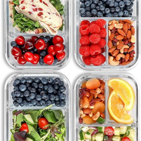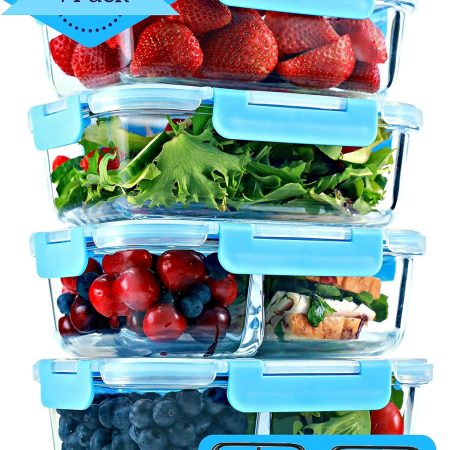 Glass Meal Prep Containers, 2 & 3 Compartments - Portion Control, Lunch Container Set, Food Storage, Airtight Lids, Oven & Freezer Safe, Leak-Proof Bento Box, 32 oz, Blue, 4 Pack